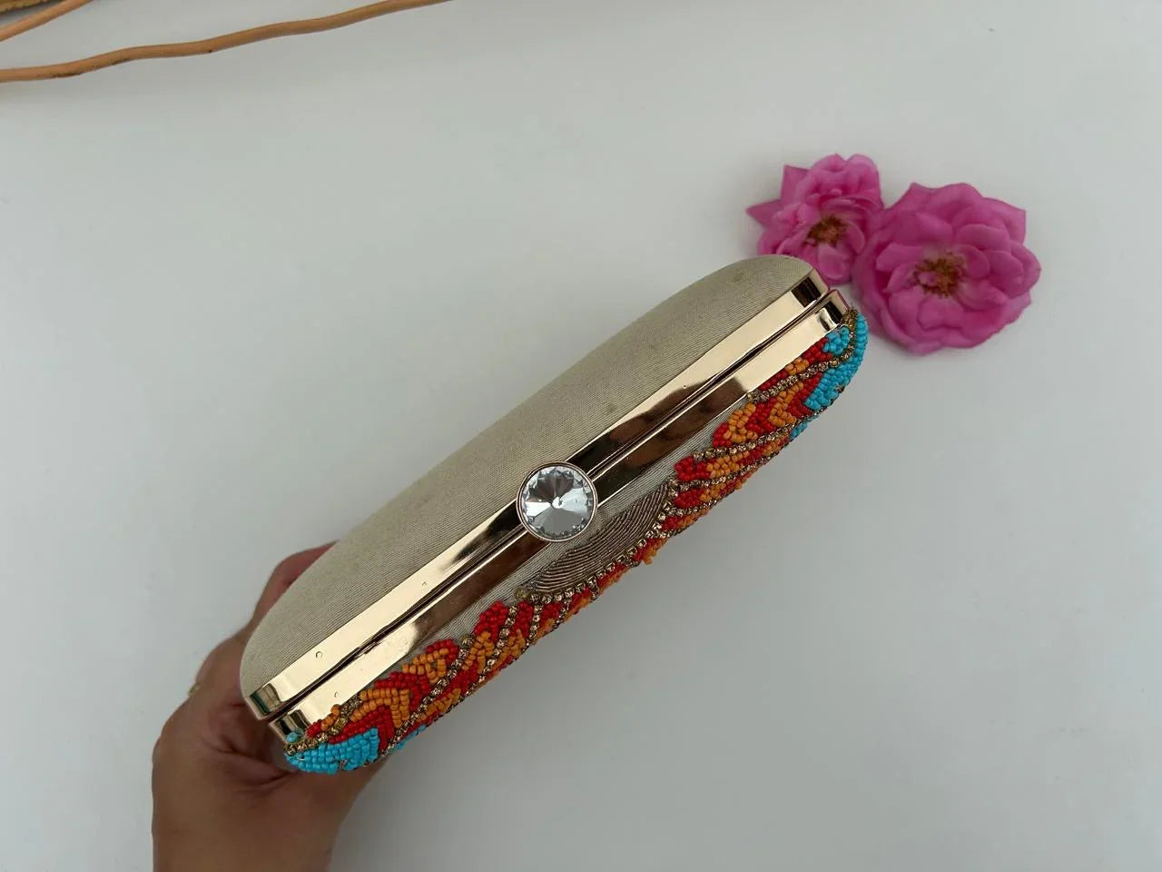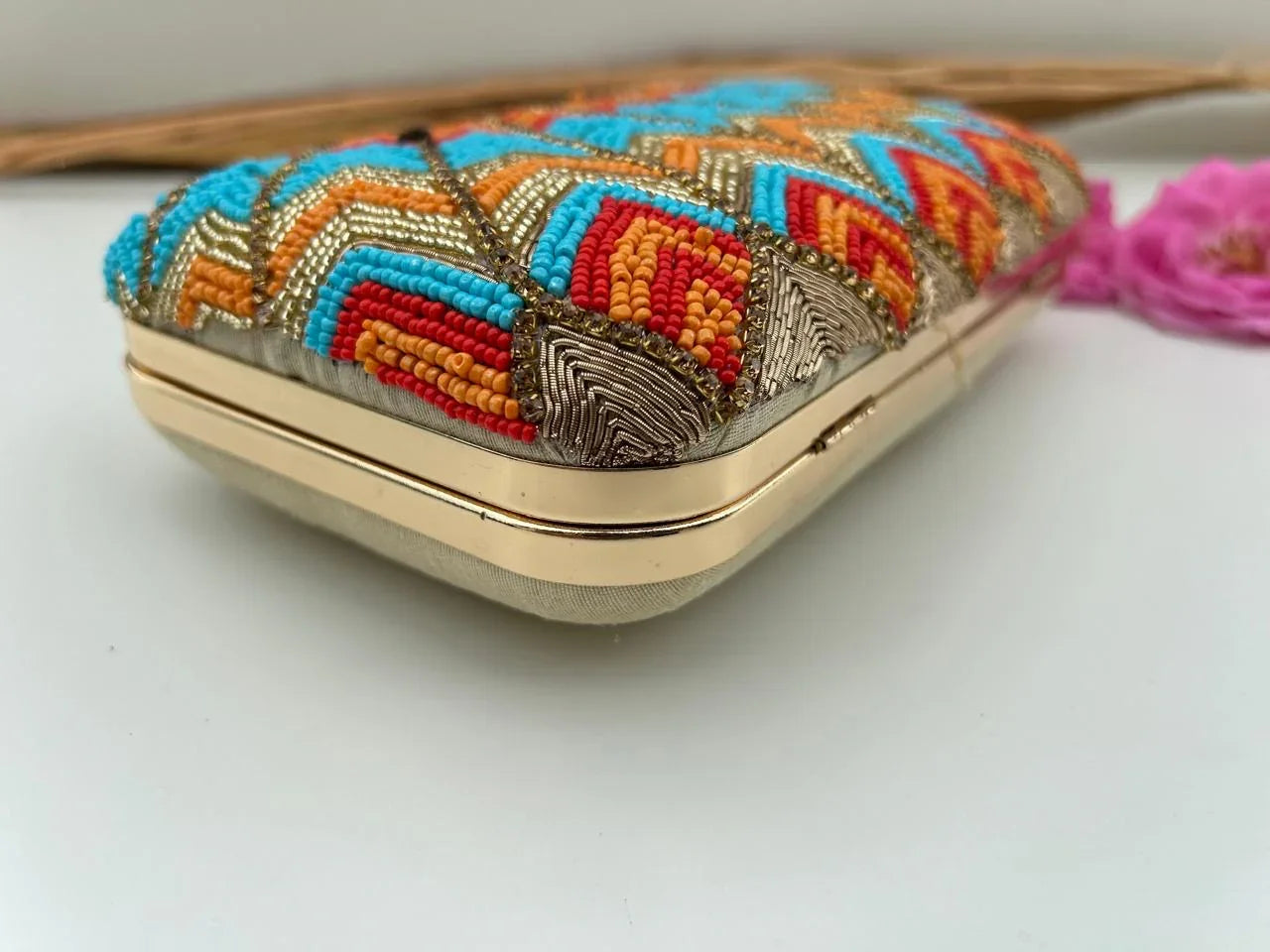 Turn heads with this eye-catching beaded clutch featuring a bold zigzag pattern in vibrant hues of turquoise, red, orange, and gold. Handcrafted with precision, this statement piece combines artistic flair with functional elegance. The box-style clutch comes with a detachable gold chain strap, giving you the option to wear it as a sling or carry it as a chic clutch. Perfect for festive occasions, weddings, or adding a pop of color to your evening outfit.